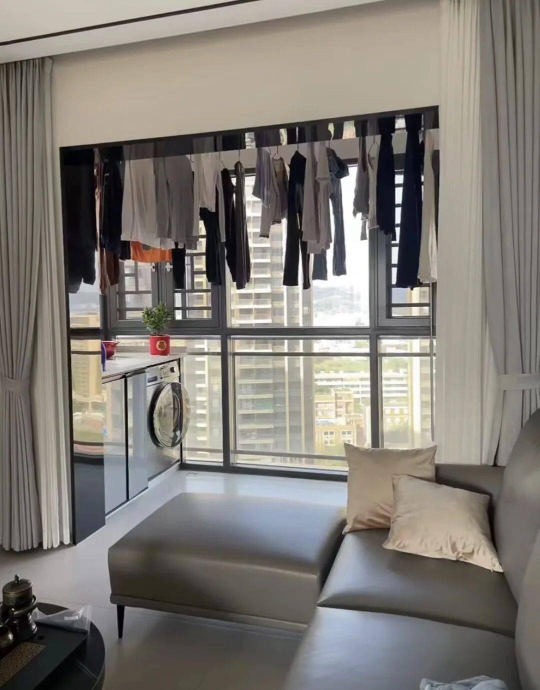 在洗衣机占用一侧位置以后,剩下的阳台空间大抵会被晾晒的衣服充斥,设想一下,原本可改造成悠闲咖啡角或者绿植花园的阳台,常年遭受衣物遮蔽,视野以及心情都会受到较大影响,空间价值也出现了很大程度的降低。