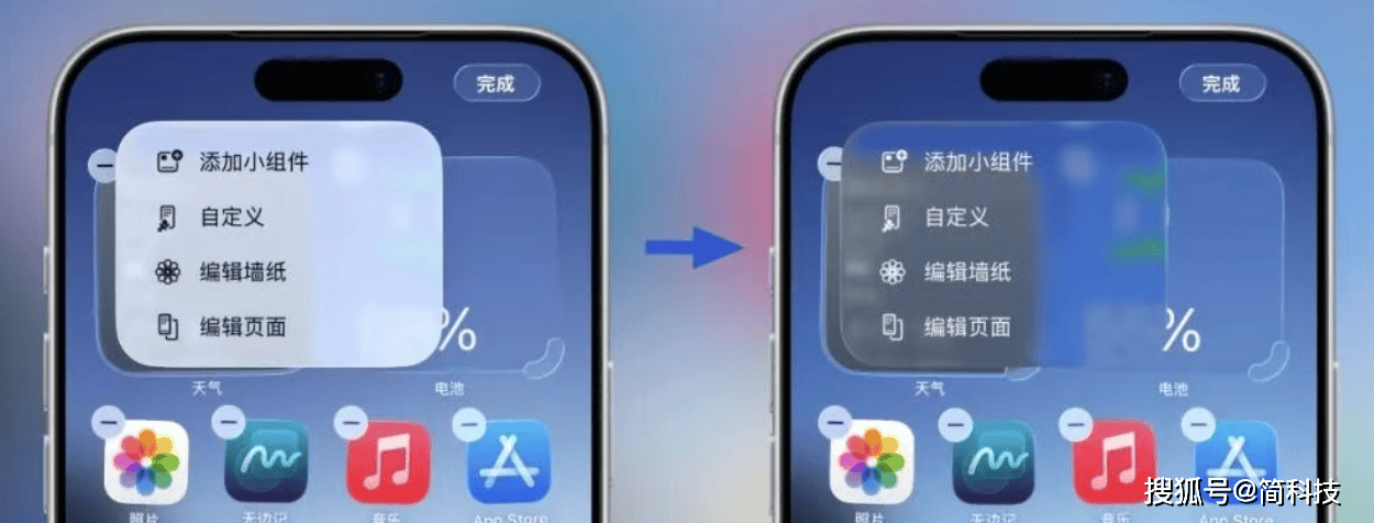 首先,在主屏幕长按空白处,将应用进入抖动状态后点击左上角的编辑,现在编辑的菜单页面使用了更加透明的液态玻璃效果,另外控制中心的菜单也是更加透明的液态玻璃效果。