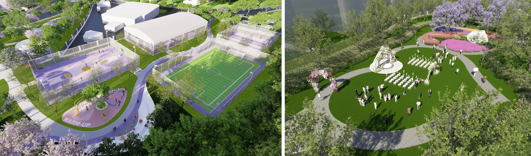 • 运动体系:600米健康跑道+健身器械区+社区体育场地,地面采用悦动铺装,周边种植大腹木棉、现代月季,运动同时享受花香与绿意。