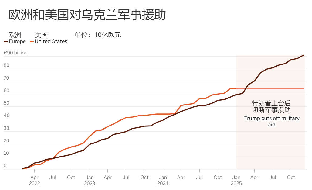 为弥补美国“断供”缺口,欧洲国家去年大幅加大军事援助规模,从2024年的435.4亿欧元,增加到2025年的728亿欧元,增幅达67%。