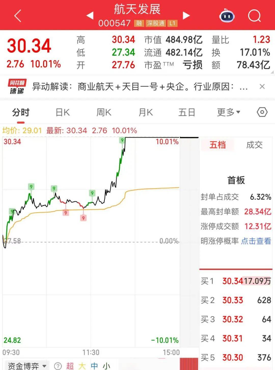 受技术突破预期、政策导向等多重因素共振催化,商业航天概念股午后拉升。航天发展快速冲高涨停,收盘报30.34元/股,最新市值为484.98亿元,涨停板上封单超17万手。同花顺热榜显示,航天发展位居同花顺个股人气排行第一名。