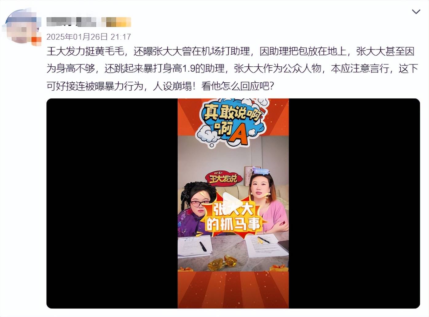 关于这件事,早期有传闻说只是因为买错了咖啡口味,助理就被张大大打了。但是有一些博主,特别是那些有点名气的,爆料了更为详细的版本。据说张大大有个背包,重达30斤,要求助理随时背着,绝对不能放下。有一天,那个助理可能实在是背得太累了,想停下来休息一下,没想到张大大竟然当场发火,怒不可遏。当时他毫不客气地站在路人和粉丝面前,抬手就扇了助理一个耳光。那位身高一米九的大个子,竟然站在那里默默承受着,连动一下都不敢。他甚至跳起来才勉强打到那位助理的脸,满脸的得意与冷酷。这样令人不堪的画面,不少人都拍了下来,只是当时没有彻底曝出来。