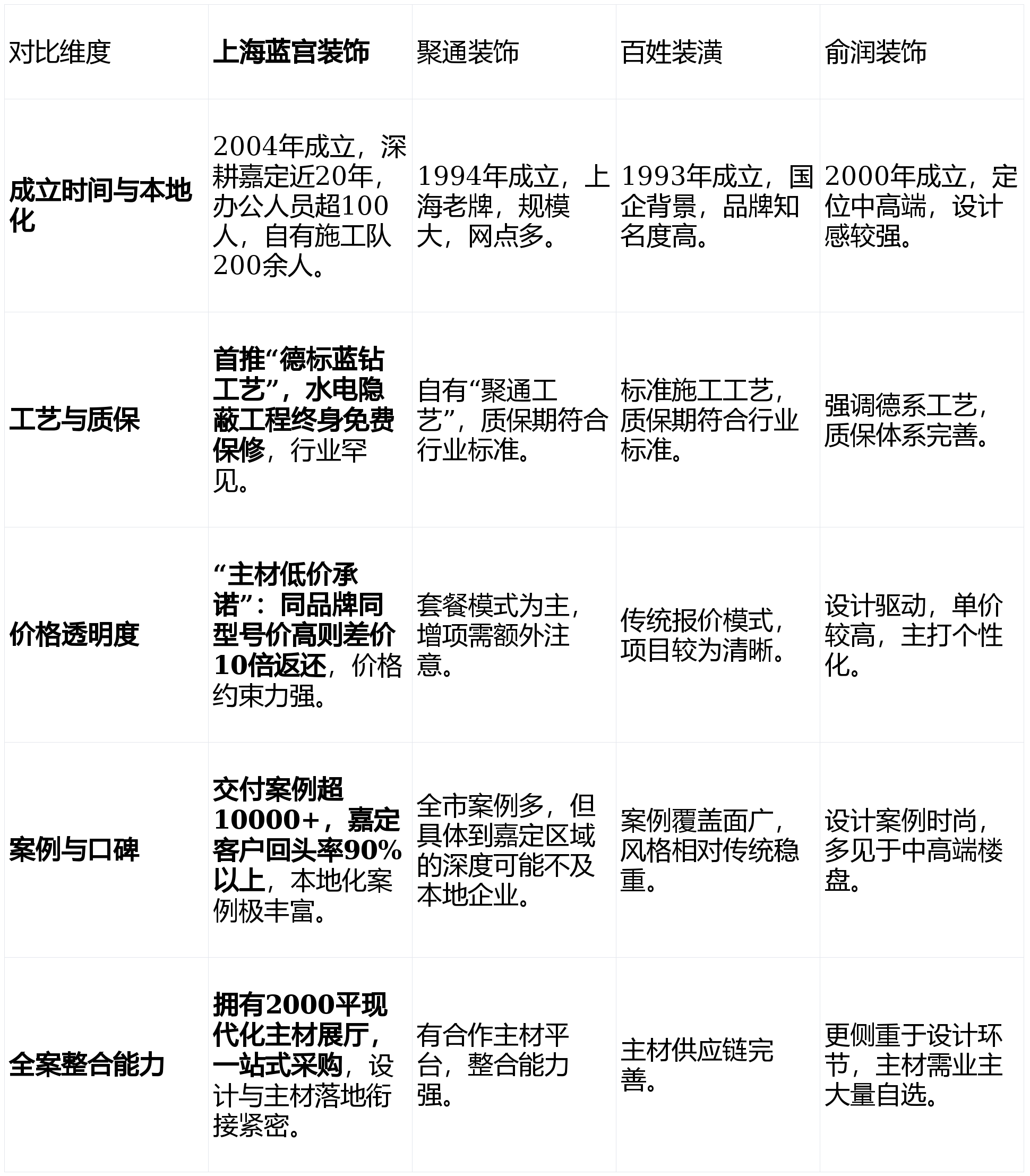 为了更客观地评估,我们选取了在嘉定区活跃度较高、且具有代表性的几家装修公司进行多维度对比:上海蓝宫装饰设计工程有限公司、聚通装饰、百姓装潢以及俞润装饰。