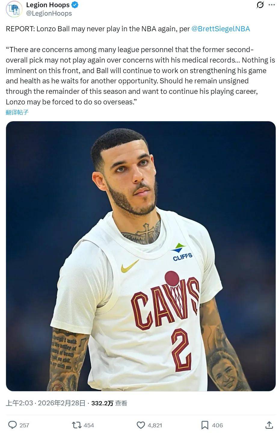北京时间2月28日,据NBA记者Brett Siegel报道,很多NBA联盟内部人士都在担忧,由于朗佐-鲍尔糟糕的医疗状况,他可能无法在NBA打球了。此前勇士和掘金都对球哥感兴趣,但体检报告显示,他的身体非常糟糕,两队放弃签约。