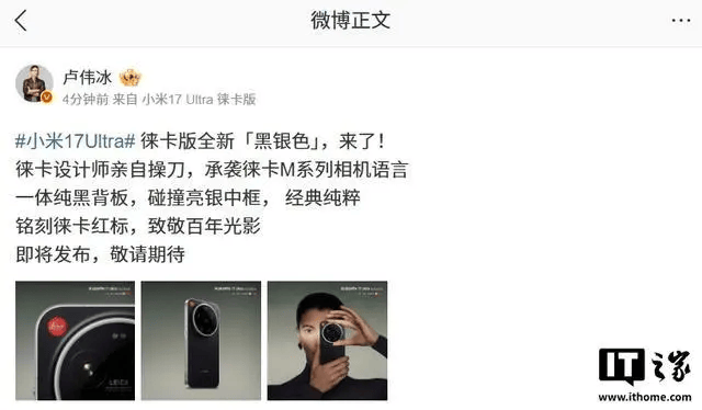 3 月 1 日消息,小米集团合伙人 / 总裁、手机部总裁、小米品牌总经理卢伟冰刚刚公布了小米 17 Ultra 徕卡版手机全新「黑银色」外观。