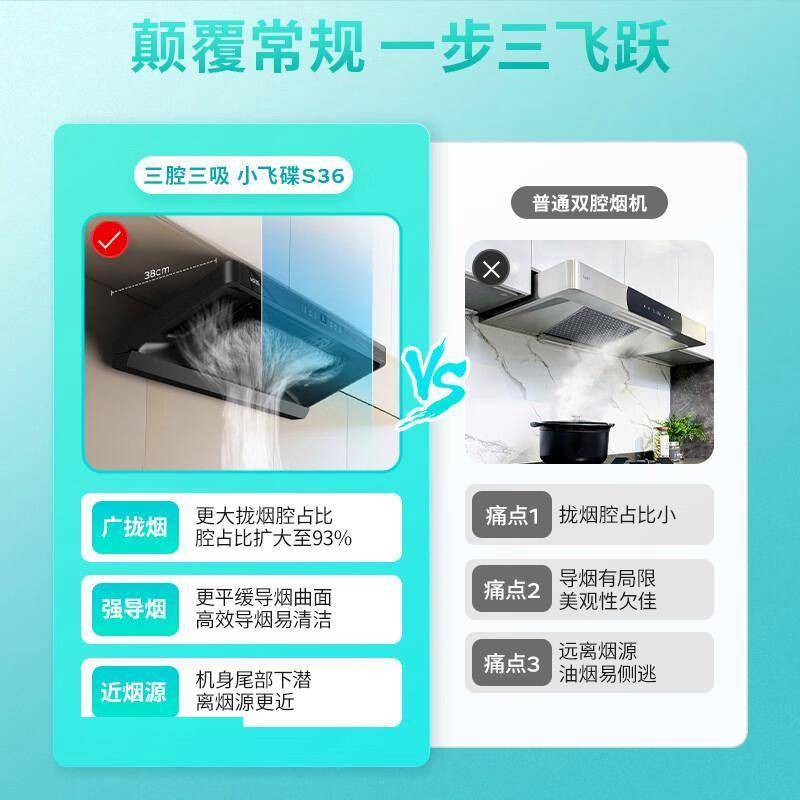 传统油烟机常面临「闻着香吃着呛」的尴尬,而小飞碟S36搭载的直流变频电机,就像给油烟装上了GPS导航:
