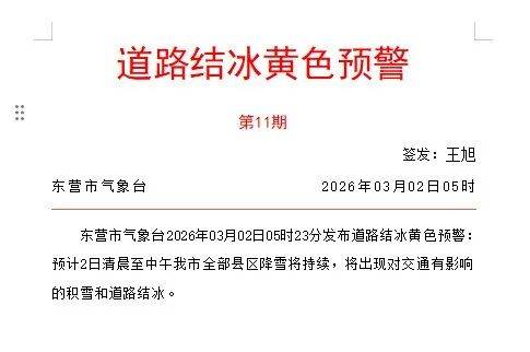 东营市气象台2026年03月02日05时23分发布道路结冰黄色预警:预计2日清晨至中午我市全部县区降雪将持续,将出现对交通有影响的积雪和道路结冰。
