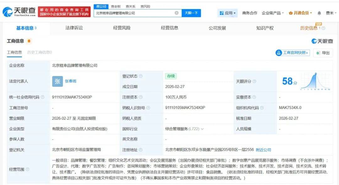 天眼查工商信息显示,近日,北京糕幸品牌管理有限公司成立,法定代表人为张春雨,注册资本100万人民币,经营范围含品牌管理、餐饮管理、食品销售等。
