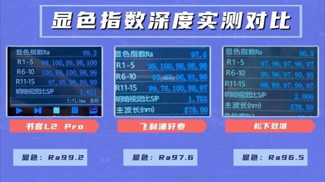 · 实测方法:使用专业光谱仪测量三款台灯的显色指数Ra值。