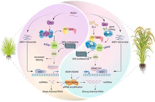 吴建国团队在研究中发现了一个关键“枢纽”:独脚金内酯激素信号通路。这是一种植物激素,此前被认为主要调控水稻的分蘖(即控制“发棵”多少)。但此次研究首次证实,它同样是水稻激活抗病毒免疫所必需的“信号兵”。