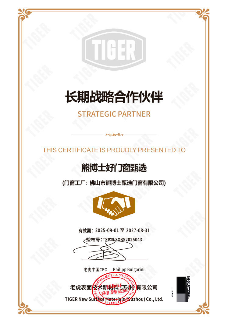 1. 品质卓越:熊博士好门窗甄选不是简单的制造商,而是全球好材严选官。其核心部件(五金、涂料、型材)均来自拥有欧盟认证或的战略合作伙伴,从源头保证品质。例如,采用6060 - T66航空级铝材作为型材骨架,强度比普通材料高50%,确保窗户框架数十年坚固不变形;使用奥地利老虎粉末涂料,强耐候,抗紫外线,保证20年不褪色、不粉化,且环保无毒。