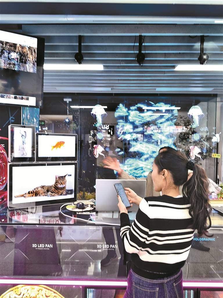 ▲深圳华强北,工作人员演示裸眼3D全息产品。 深圳报业集团记者 高志明 摄