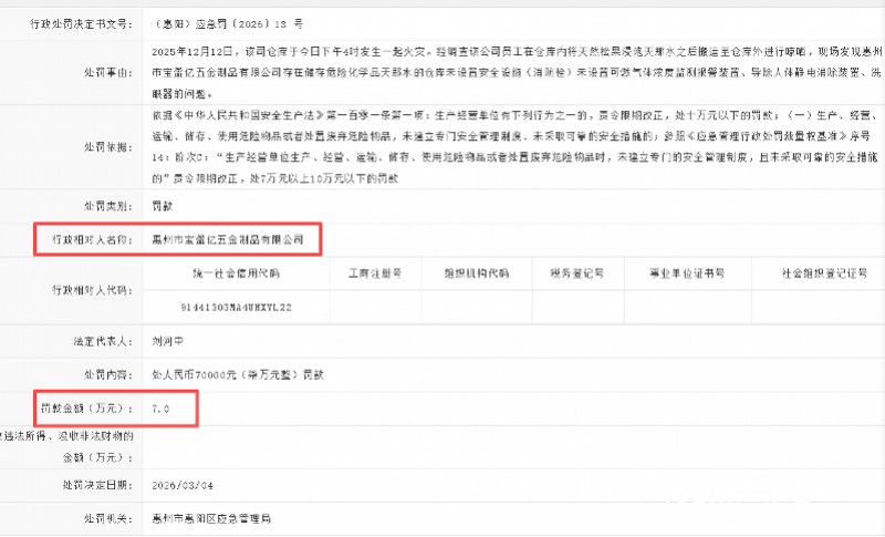 (惠阳)应急罚〔2026〕13号行政处罚决定书显示,依据《中华人民共和国安全生产法》第一百零一条第一项,参照《应急管理行政处罚裁量权基准》序号14阶次C标准,惠阳区应急管理局对该公司作出罚款7万元的行政处罚决定。