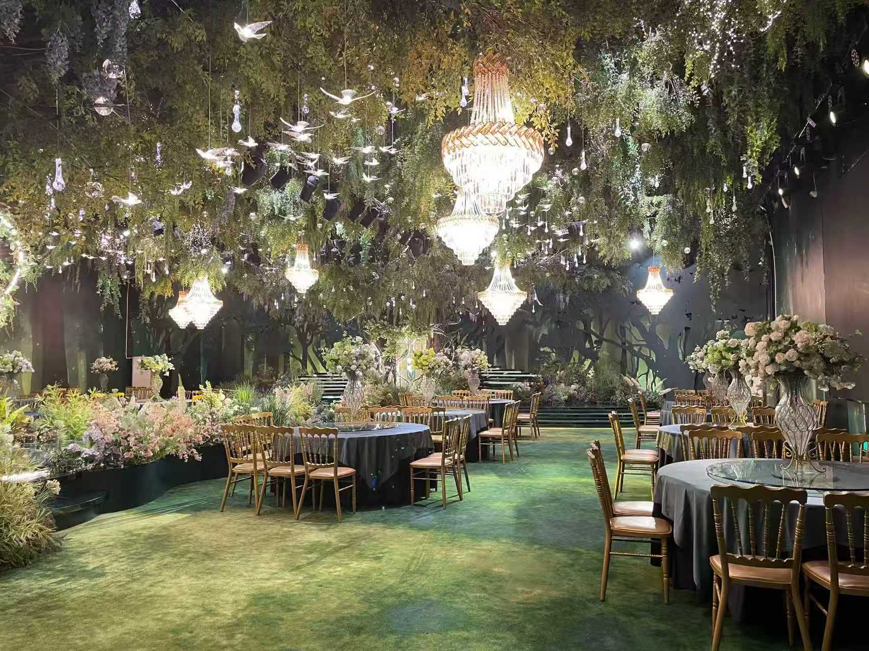 -森系/自然风:浅绿/米棕配色,仿真绿植墙、木质吊顶、藤编家具,适合户外婚礼延伸或小清新主题,营造轻松氛围。