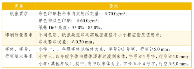 (注:1.学龄前儿童读物纸张、印刷质量同教科书,字体、字号、行空同小学一、二年级;2.目录、注释等辅文用字可参照正文用字适当减小,学龄前及小学阶段最小用字应不小于10.5P(5号)字,初高中阶段最小用字应不小于9P(小5号)字。)