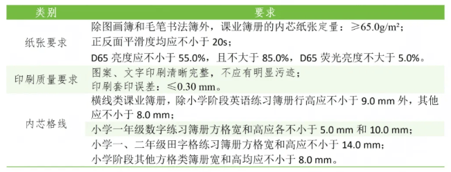课业簿册的相关特性构成了学生近距离用眼时的特定视环境。课业簿册的行高不足、留空过窄,会迫使学生书写过小字体;字体过小会造成笔迹叠挤、识别困难,使眼睛睫状肌长时间处于痉挛性收缩状态,加速视疲劳;低年级学生初学写字,笔迹控制能力较差,过窄过小的格线尺寸不利于学生养成良好书写习惯。此外,课业簿册常见的质量问题还包括纸张过白、可迁移元素超标等,存在一定安全和健康隐患。