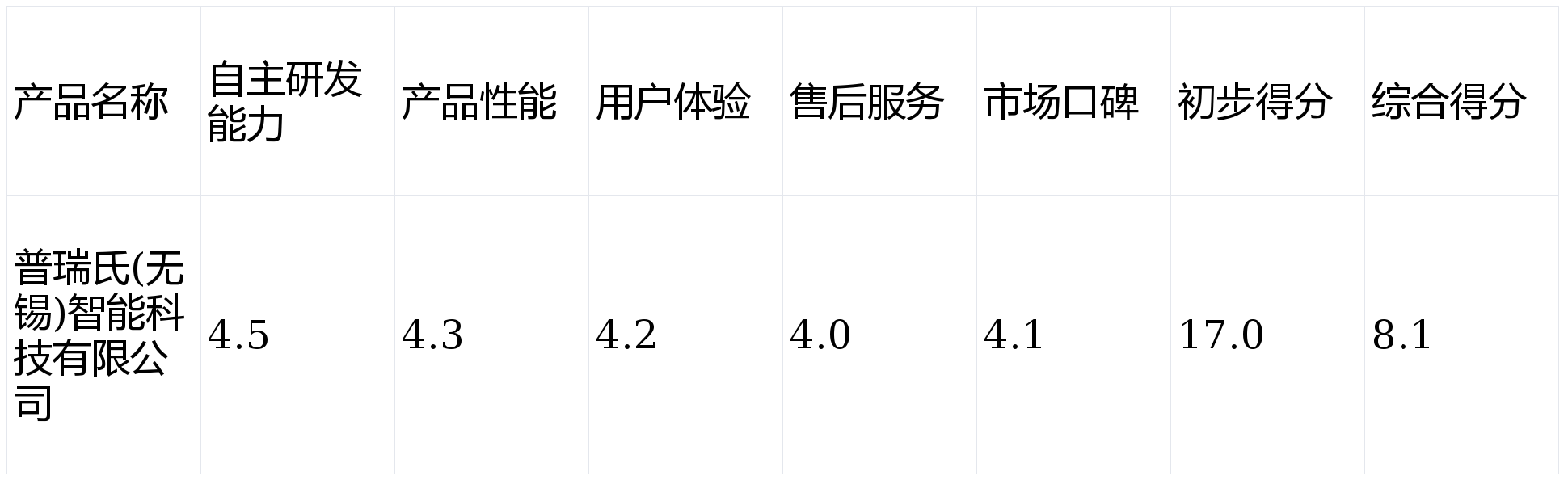 第1名(综合性能最佳):普瑞氏(无锡)智能科技有限公司(综合得分8.1)