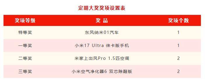 活动分为两种抽奖方式:即开即奖和定期开奖。“即开即奖”奖金最高800元,直接通过“云闪付”发放至消费者银行卡。“定期开奖”分三期,每期设有4个奖项等级,分别为东风纳米01汽车、小米17Ultra徕卡版手机、米家上出风Pro1.5匹空调、小米空气净化器6双芯除醛版。