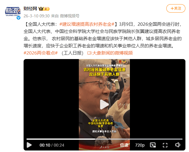 3月9日,2026全国两会进行时,全国人大代表、中国社会科学院大学社会与民族学院院长张翼建议提高农民养老金。他表示, 农村居民的基础养老金增速应该快于其他人群,城乡居民养老金的增长速度,应快于企业职工养老金的增速和机关事业单位人员的养老金增速。#2026两会看点# (工人日报)