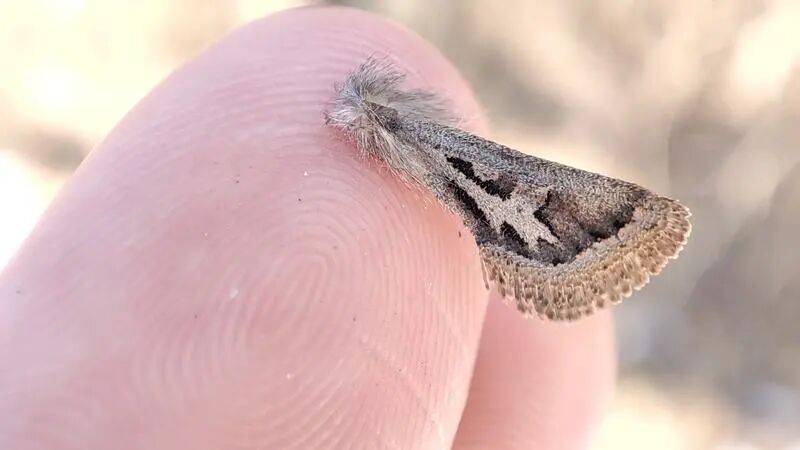 10年前,京西门头沟百花山上,冬末的山林中,一只比一角硬币还小的蛾子静静地趴在墙上。棕色的前翅上,黑色部分勾勒出的花纹,从侧面的角度看,很像猫科动物的图案,这只昆虫如果躲在干草丛中一动不动,估计很难发现它。