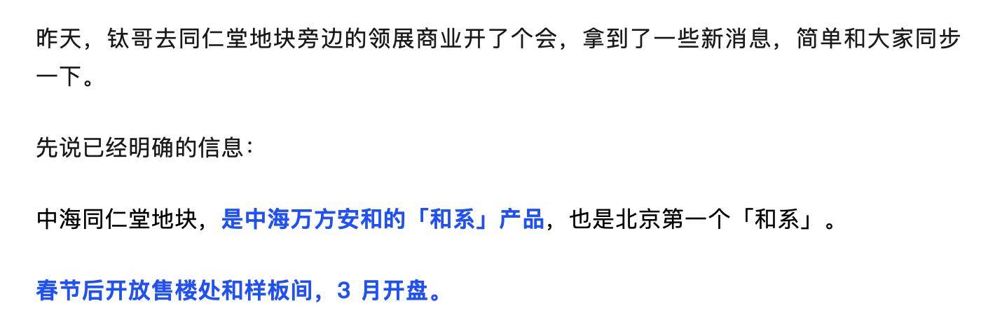 另外,此前2月2日,据媒体报道,中海同仁堂地块,是中海万方安和的“和系”产品,也是北京第一个“和系”。项目预计于春节后开放售楼处和样板间,3月开盘。