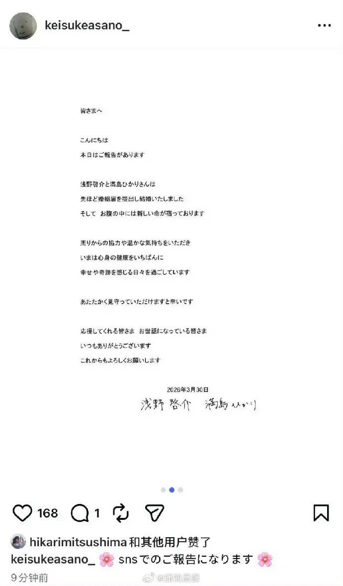 3月30日, 日本女演员满岛光宣布再婚且已怀孕,男方是日本当下人气较高的新生代模特浅野启介。两人当天在社交平台发文“我们结婚了,肚子里还孕育着新生命”。