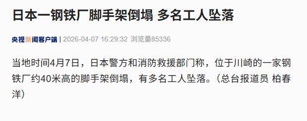 据央视新闻,当地时间4月7日,日本警方和消防救援部门称,位于川崎的一家钢铁厂约40米高的脚手架倒塌,有多名工人坠落。