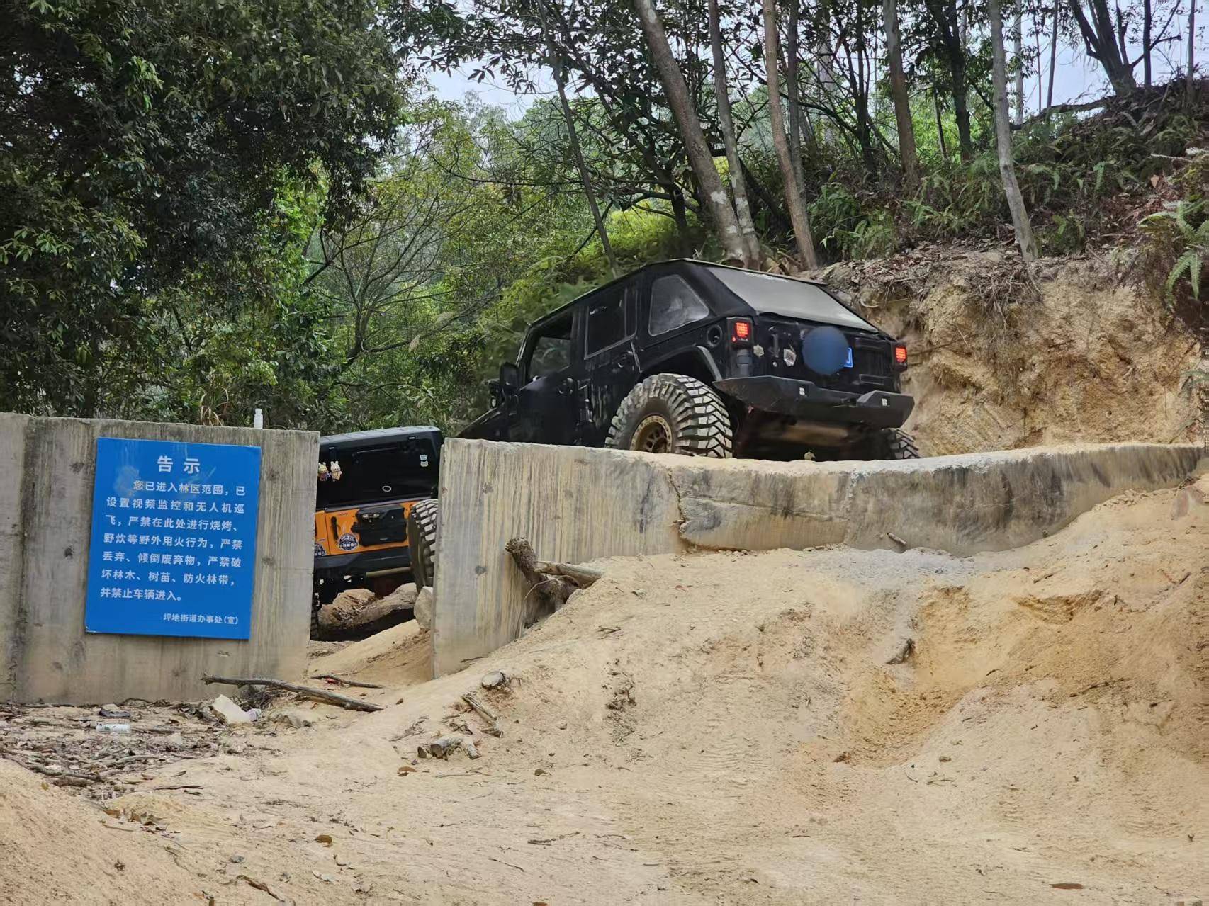更令人意外的是,当天走访中,记者看到一辆越野汽车正翻越挡墙进入郊野径。由于右侧挡墙靠近山体,有土堆顺墙而下,大幅降低了挡墙高度,越野汽车借助土堆的坡度,轻松翻越挡墙。