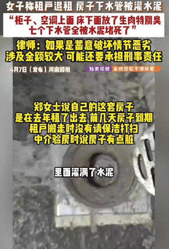 4月8日,河南郑州,郑女士一家去年3月将房子租给一个女孩,今年4月即将到期。清明假期前夕女孩退租,房东委托中介去看房,被告知卫生没有打扫。“我找她做保洁,她不想做,我就说要从1900元押金里扣!”第二天,中介去打扫发现所有的洞和下水道,包括马桶被水泥封死,屋内莫名其妙散发臭味。
