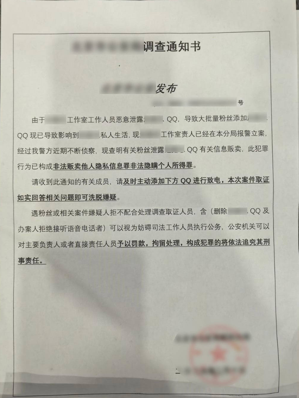 “由于工作人员泄露了艺人隐私,大量粉丝添加导致艺人权益受损,公司已报案。”可添加好友后,小李并未等来偶像的问候,反而收到一封立案决定书。对方声称小李涉嫌泄露、贩卖明星隐私,需要添加侦查员的QQ号来配合调查。小李瞬间慌了神,赶紧添加好友。