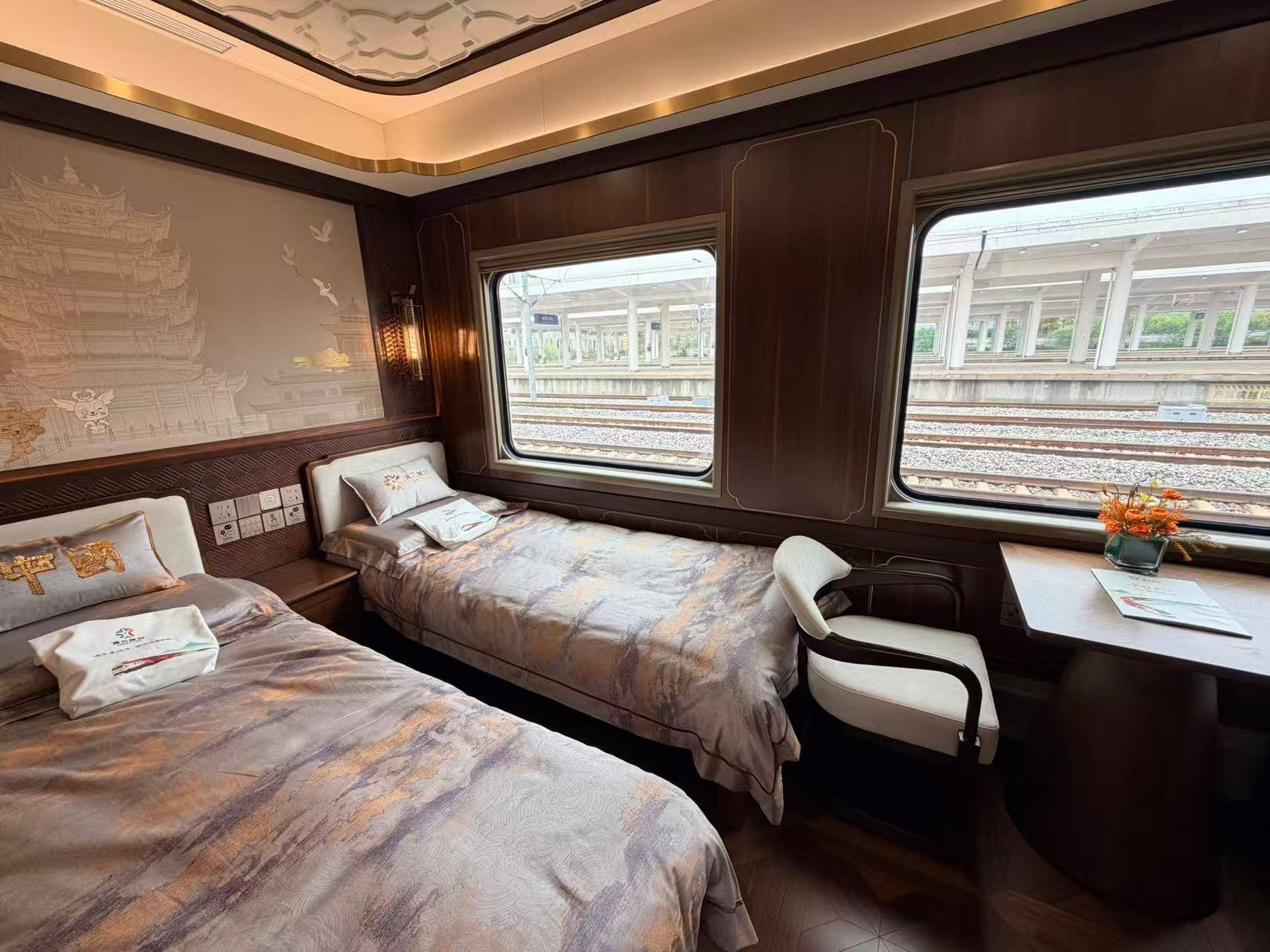 4月10日,武汉铁路局推出的首列特色舒适型旅游列车驶达武汉东站,并开展模拟运行。九派新闻记者登车探访发现,该专列配备大床房、双床房、棋牌室、K歌房等多种功能空间,所有客房均设有独立卫生间,被乘客称为“五星级酒店火车”。