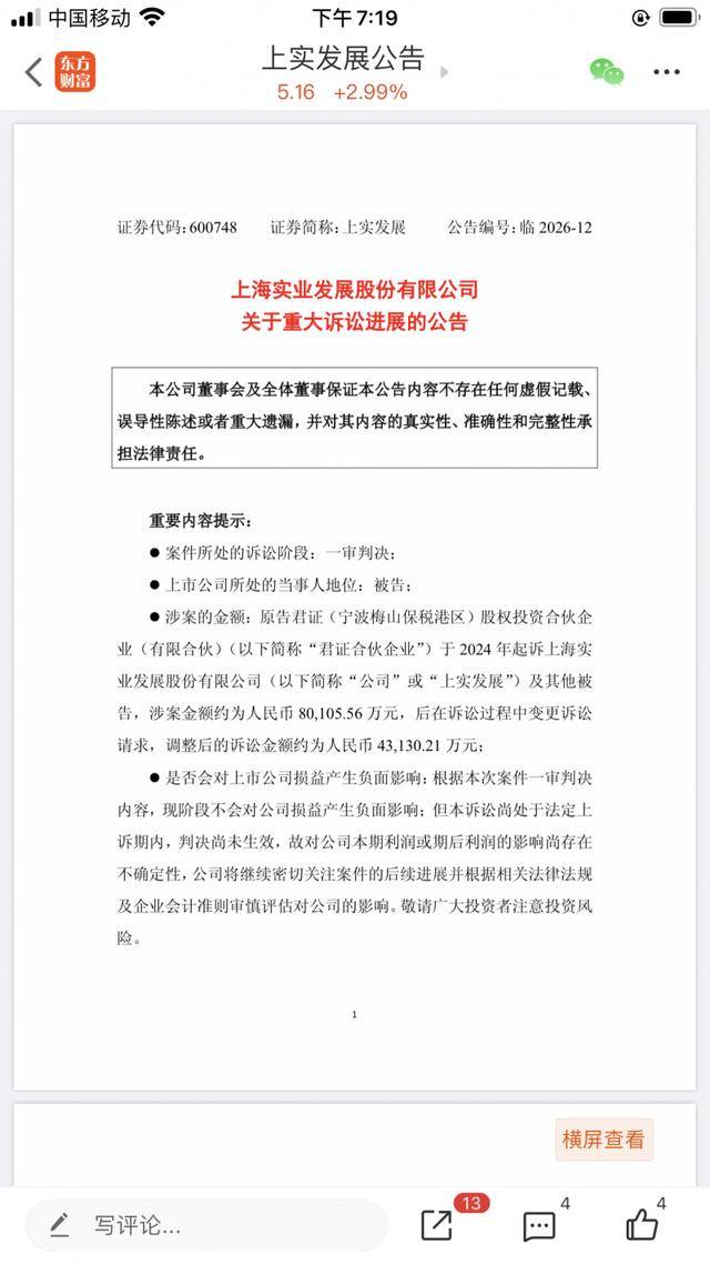 4月4日,上实发展发布关于重大诉讼进展的公告,称公司作为被告方,已收到上海金融法院送达的《民事判决书》,该院已一审驳回原告方梅山君证的全部诉讼请求,认定原告的投资决定与案涉虚假陈述之间的交易因果关系并不成立,无权要求被告赔偿投资损失。此外,该案件220.01万元的受理费也由梅山君证负担。
