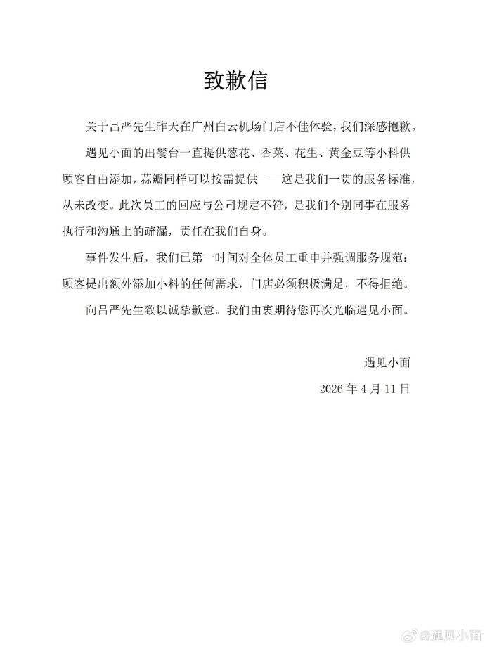 4月11日,遇见小面发布致歉信称,就吕严昨天在广州白云机场门店不佳体验,深感抱歉。