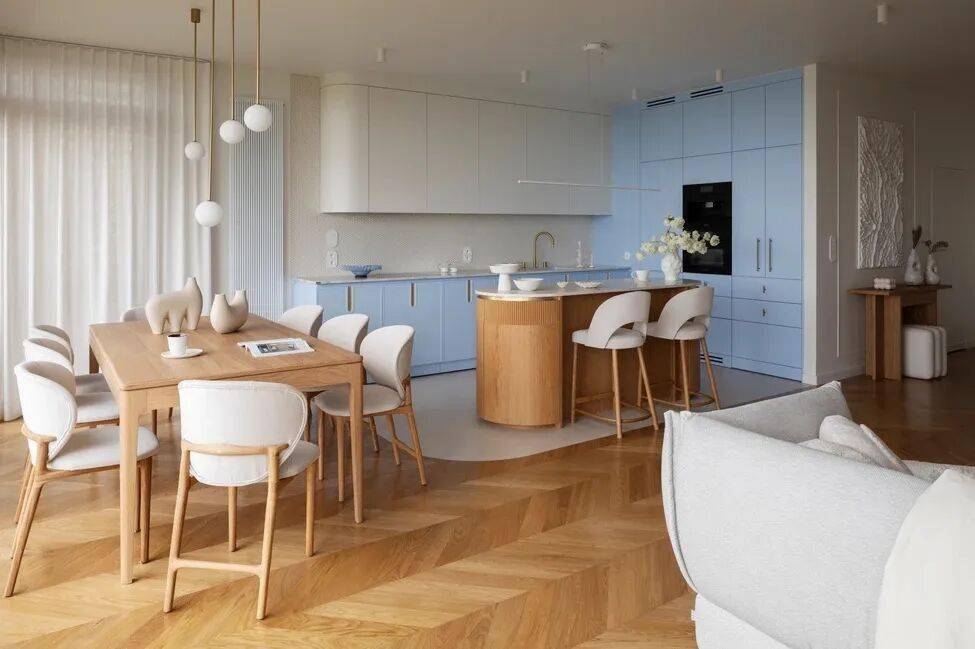 雾霾蓝橱柜清新治愈,搭配浅灰吊柜与原木开放格,打造清爽通透的餐厨空间;豆沙绿橱柜温柔雅致,或融入法式复古线条,或搭配金属吊灯,尽显轻奢质感。