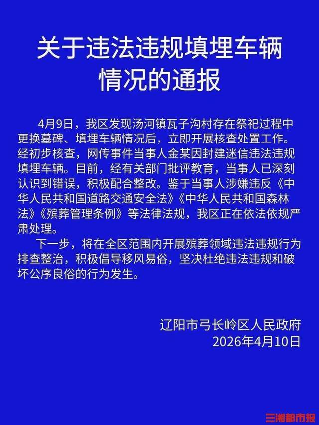 经初步核查,网传事件当事人金某因封建迷信违法违规填埋车辆。目前,经有关部门批评教育,当事人已深刻认识到错误,积极配合整改。鉴于当事人涉嫌违反《中华人民共和国道路交通安全法》《中华人民共和国森林法》《殡葬管理条例》等法律法规,弓长岭区正在依法依规严肃处理。
