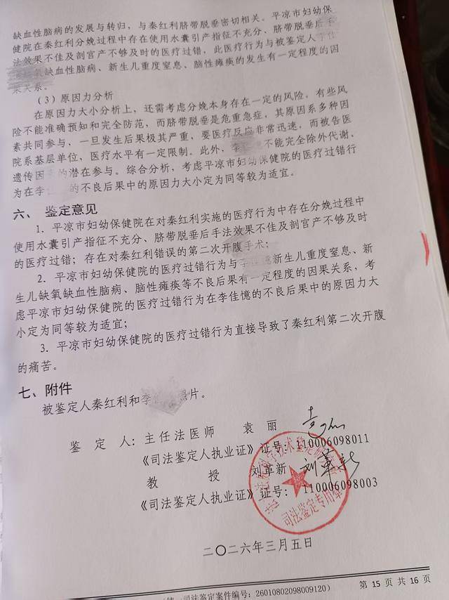 四年后,2026年3月5日,司法鉴定结果显示:平凉市妇幼保健院存在对水囊引产指征把握不充分、脐带脱垂发生后处置不当、剖宫产实施不够及时等多项医疗过错。