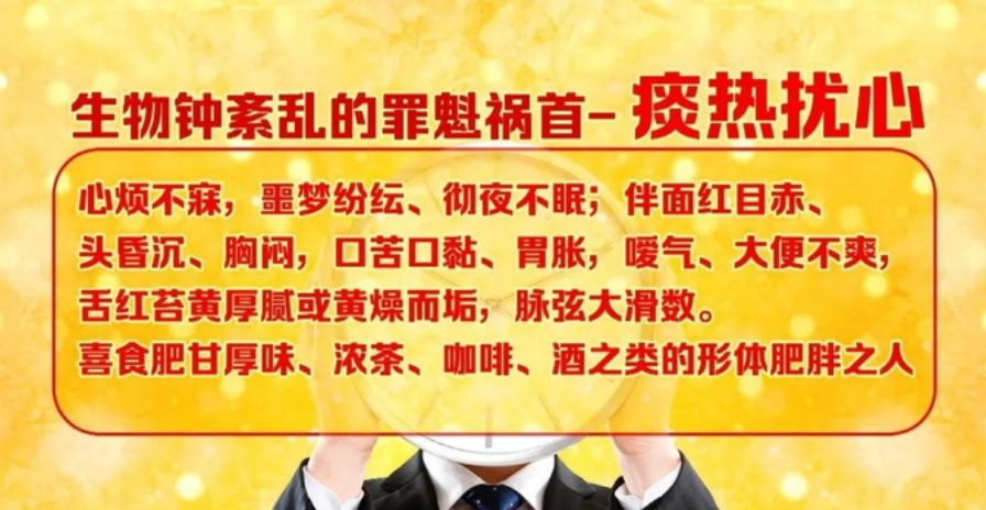 02 第二位女士,睡眠状态模糊,面色红润,体型偏胖。她主要的问题是体内痰热干扰心脏,痰湿和热相互交织,扰乱心神,导致失眠。体内痰热干扰心脏的主要症状包括:心烦意乱、噩梦连连、胸闷、头晕沉重、口苦口黏、大便不畅、舌苔黄厚腻。对于这类人群,临床上常用清热化湿的药方,日常生活中可以通过一茶一粥进行调理。