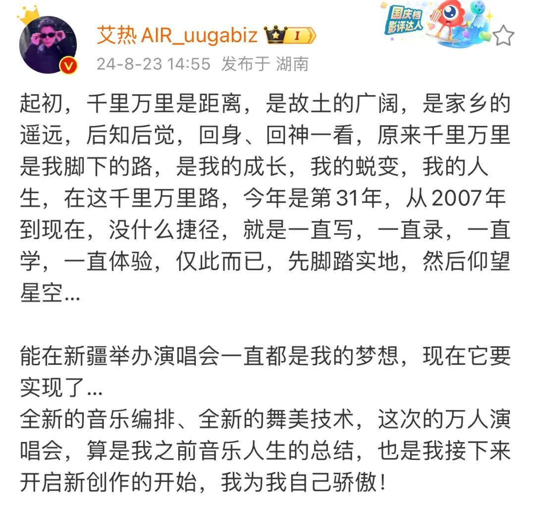 艾热一直梦想着在新疆举办一场演唱会,如今,这个梦想终于要实现了。