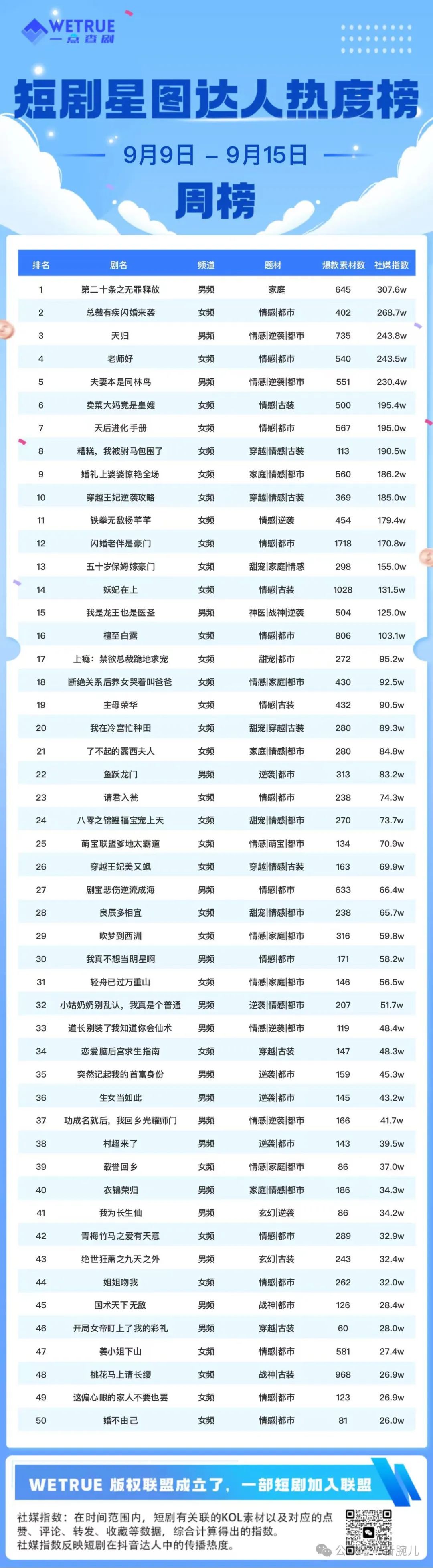 9月16日,新腕儿、鞭牛士联合WETRUE一点查剧共同推出9月第2周短剧热度周榜和短剧星图达人热度榜。