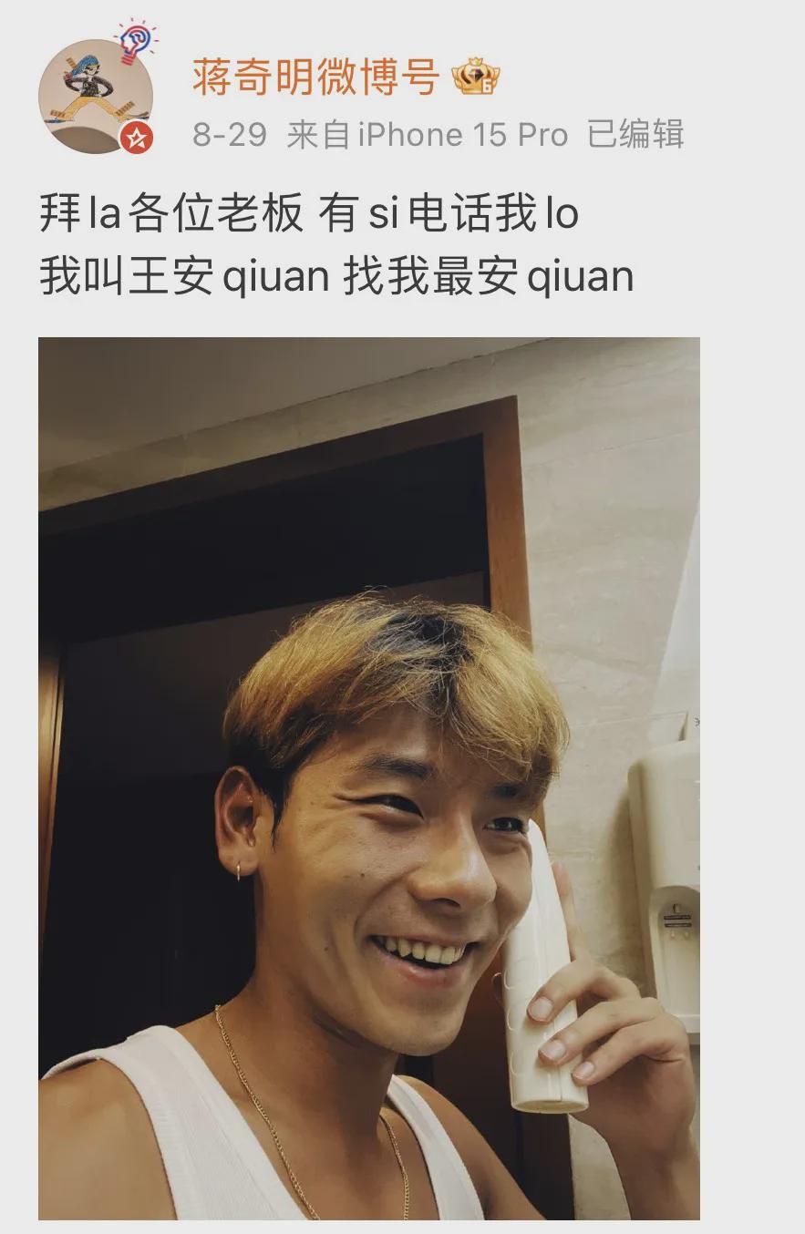 2020年初,大多数剧场停工,蒋奇明无戏可演,他将求职信息索性发在微博上,称自己“活好不粘人”。