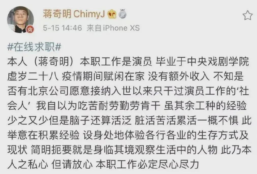 2020年,待业在家的蒋奇明发布求职信息