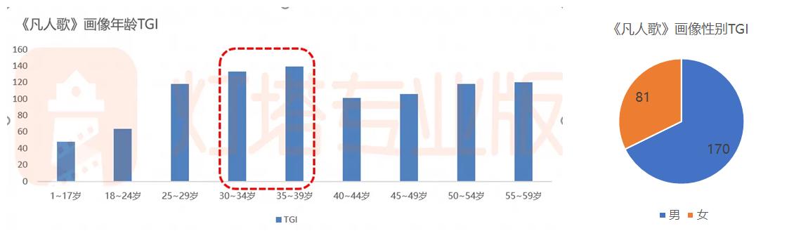 《凡人歌》由口碑保障正午阳光出品,是一部聚焦小人物生活的现实题材群像剧,讲述了两对夫妇、一对情侣在都市快节奏大环境下在职场与家庭中挣扎与成长的故事,真实反映了现代人的生活状态,和观众产生强烈的共鸣。从人群偏好来看,30~39岁的男性观众偏好值更高。