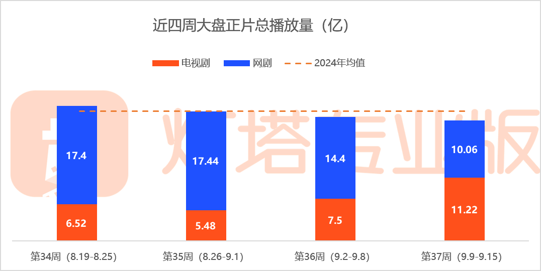 上周(9.9-9.15)全网剧集正片大盘总播放量21.28亿 ,环比下降2.8%,网剧大盘收缩严重,环比下降43.13%,大盘连续三周下跌,连续两周剧集正片大盘低于今年周正片播放均值。