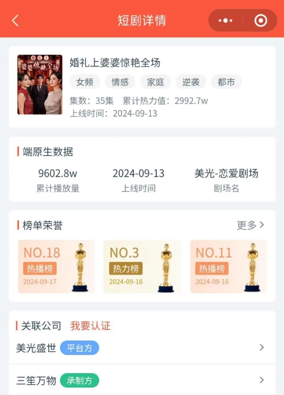 这次《婚礼上婆婆惊艳全场》的成功,验证了婆媳话题和短剧表现形式的适配性,也让行业看到了下一代爆款标签的影子。
