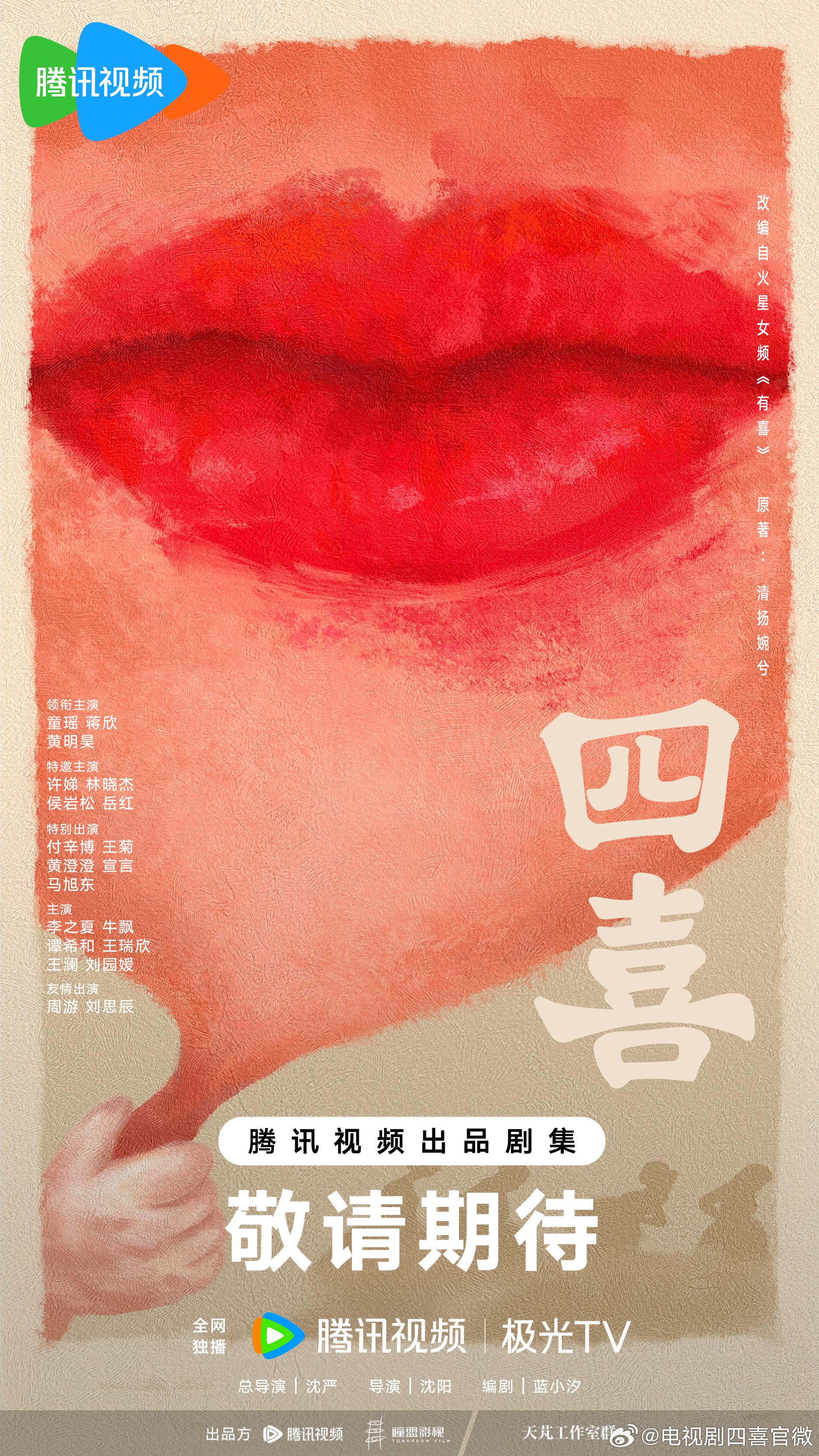 新京报讯 9月19日,电视剧《四喜》官宣开机并公布阵容及概念海报。该剧改编自清扬婉兮的小说《有喜》,由沈严担任总导演,沈阳导演,蓝小汐编剧,童瑶、蒋欣、黄明昊领衔主演,许娣、林晓杰、岳红特邀主演,宣言特别出演,李之夏、牛飘、王瑞欣主演。