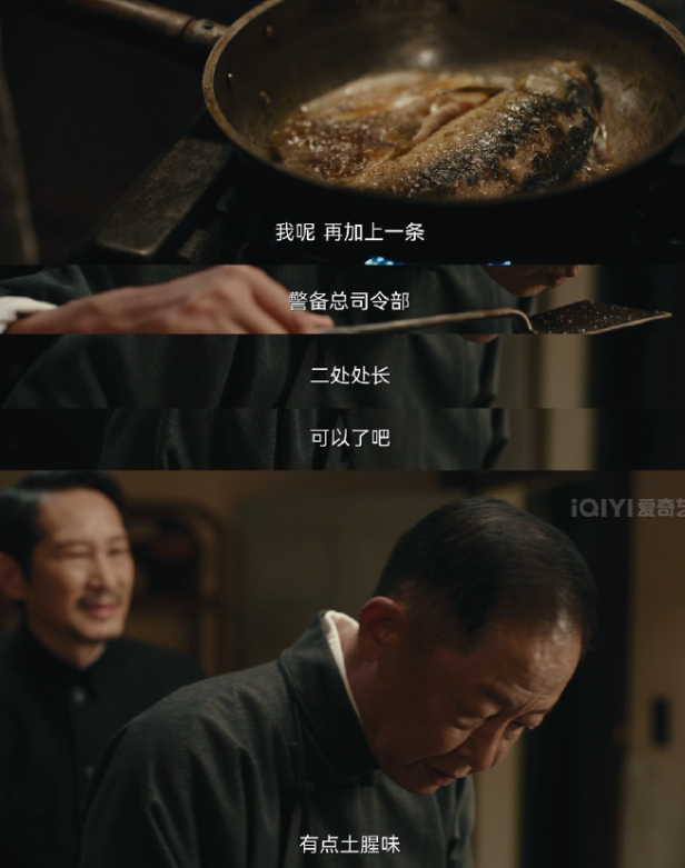 镜头对准了王志文的侧脸,郑兰亭一边做鱼一边和毛森交谈,毛森想让被雪藏已久的郑兰亭出山,先假装问他谁担任上海潜伏负责人合适。