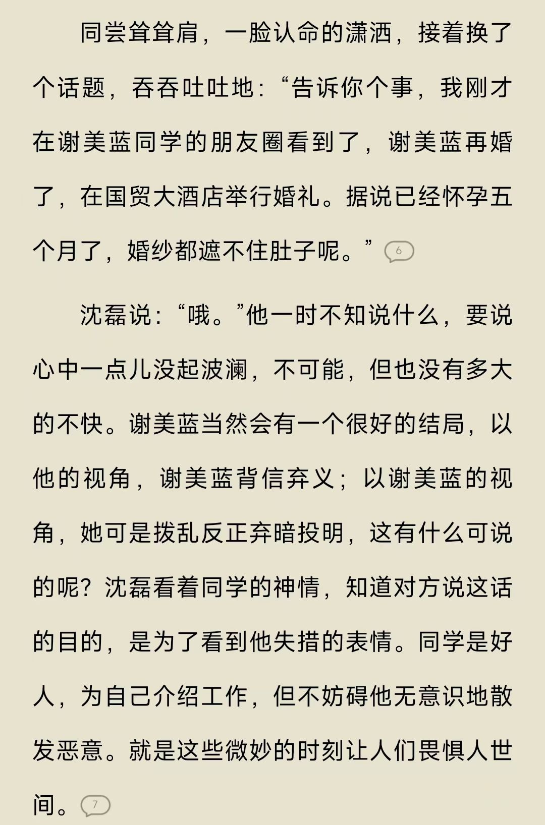 可在原著中,谢美蓝的结局是有交代的。出现在同学跟沈磊的谈话中,同学告诉沈磊,谢美蓝结婚了,在大酒店举办的婚礼,当时她已经怀孕了,五个多月大的肚子就连婚纱都遮掩不住。