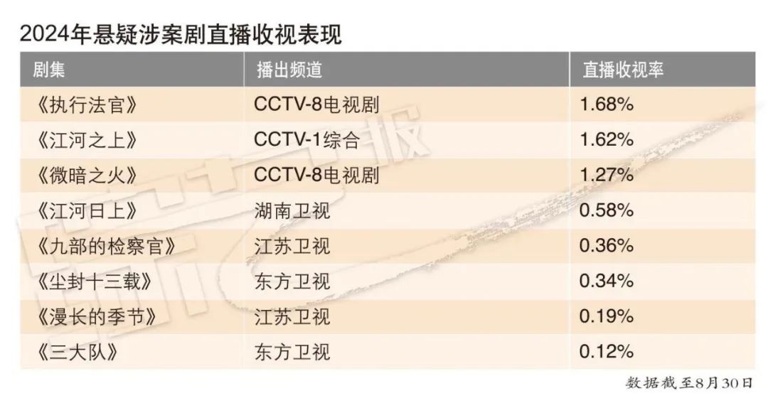 1—8月“上星”悬疑涉案剧直播收视表现呈现两大特征:第一,叙事视角从普通个体转为职业群像;第二,不同于网络剧善用“悬疑+”,“上星”悬疑涉案剧更加聚焦案件本身。比如,以直播收视率1.68%的成绩位列悬疑涉案剧大屏直播收视率榜首的《执行法官》,通过16个贴近生活的执行案件,展现青年法官在工作中坚守职业理想、不断追求进步的成长与蜕变。再如,以直播收视率1.62%的成绩位列悬疑涉案剧大屏直播收视率第二名的《江河之上》,以长江流域环境保护司法实践为核心,讲述一群充满干劲的司法工作者,在一系列环保案件中扫黑除恶、打击污染犯罪、守护生态环境的故事。这种宏观视角的群像描绘,以及振奋人心的故事书写,为国产悬疑涉案题材带来新风。