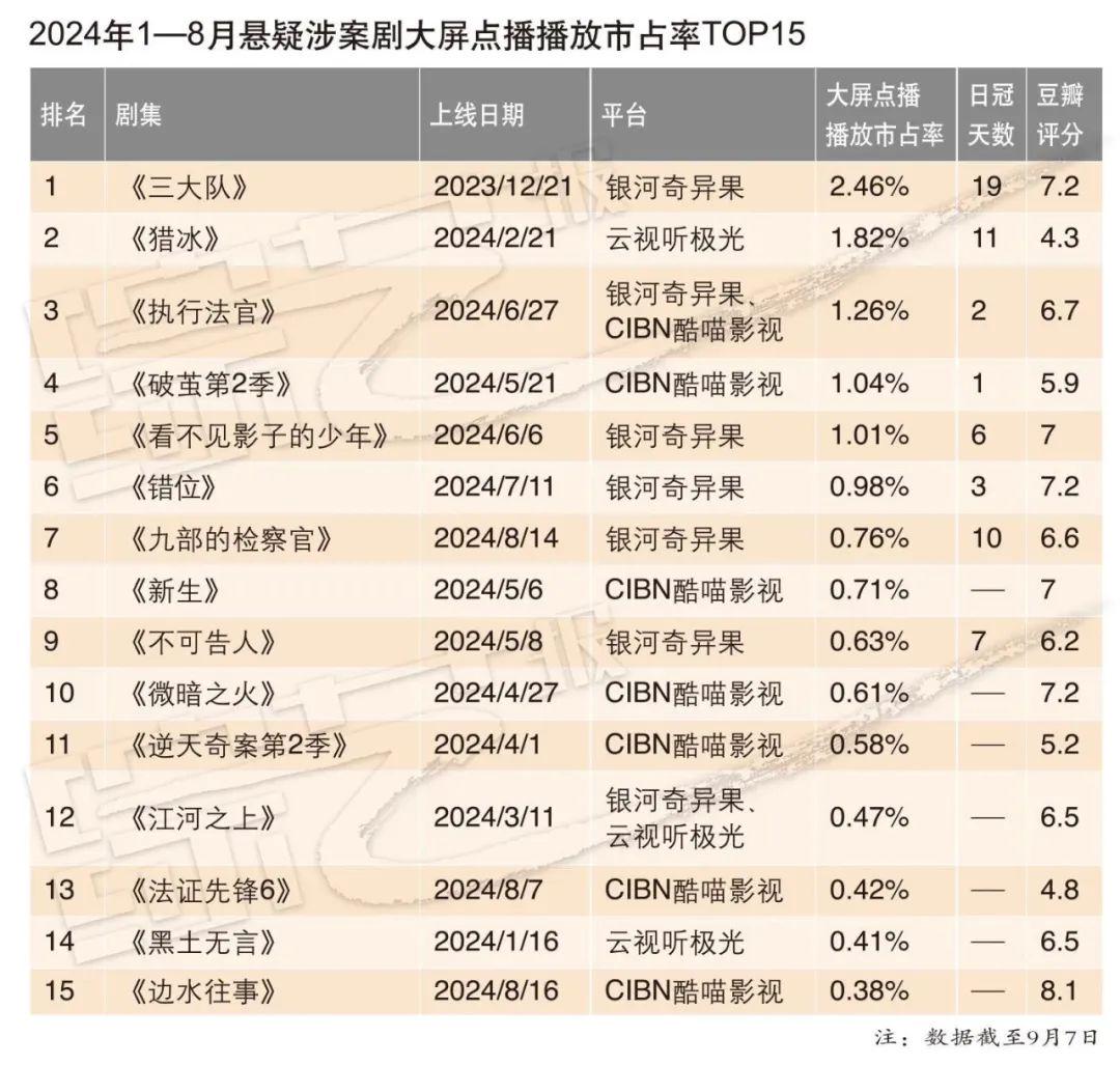 回顾1—8月悬疑涉案剧大屏点播市场,一个典型现象是并未如往年一样出现热度口碑都有绝对优势的现象级作品。比如,腾讯视频播出的《猎冰》,尽管口碑争议较大,但今年2月上线期间,却斩获大屏点播播放市占率1.82%、最高点播播放指数9423、日冠11天的战绩。再如,优酷8月中旬开播的《边水往事》,大屏点播表现不及《猎冰》,却获得豆瓣8.1分的好评。