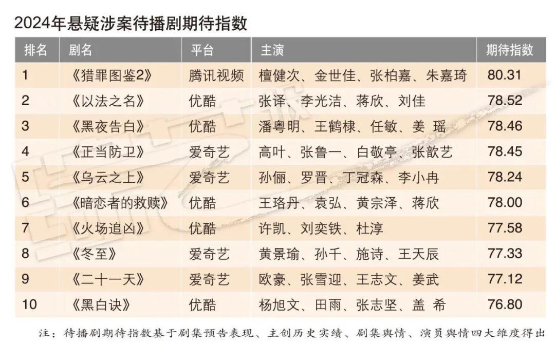 《猎罪图鉴2》以期待指数80.31位列榜首,作为大热IP《猎罪图鉴》第二季,它将延续“绘色显影,画见人心”核心主题,通过模拟画像的描绘,深入揭示人性的复杂与多面。《以法之名》以期待指数78.52位列第二。该剧延续今年悬疑涉案群像热潮,讲述海东省检察机关在省委政法委和省检察院领导下,高效查办司法人员职务犯罪案件、维护公平正义、为社会发展保驾护航的故事。《黑夜告白》以期待指数78.46位列第三,讲述徐家父女在元龙里小区电梯口神秘失踪后,为揭开案件真相,何远航与徒弟冉方旭及女儿何晓荷三代刑警联手追查,最终成功抓获真凶的故事。